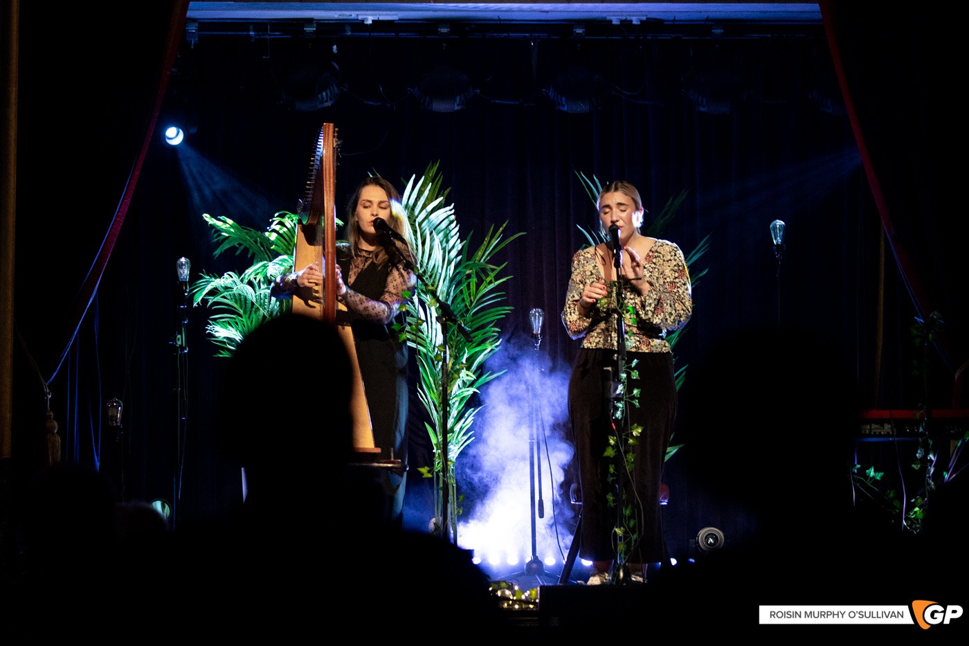 Surrounding the duo as they played were three ferns, each divided by a single bulb propped up by a long, dark lamp. Scattered across the floor were vines, which found themselves curled across the microphone stands and causing the fairy lights on the floor around it to emit a beautiful shade of juniper.