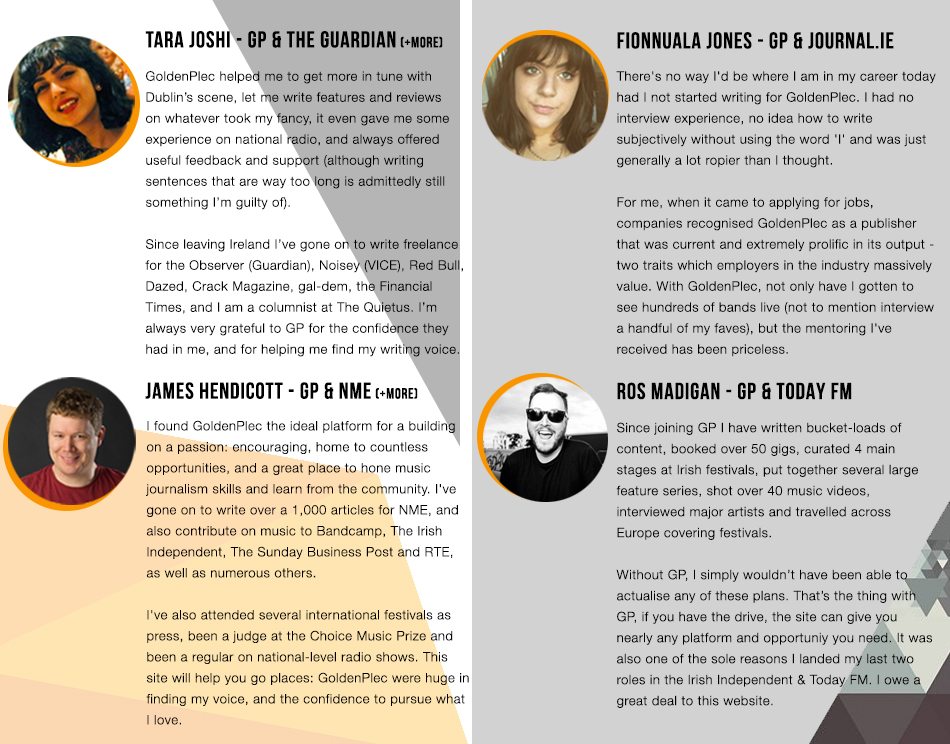 GoldenPlec is entirely volunteer run. From the news, reviews, features and interviews, everything is done by volunteers who are doing it for experience, practice or for fun. Some of our writers have been picked up for print and major online publications during their time with GoldenPlec – the list includes The Guardian, NME, VICE, Rolling Stone, Irish Times, gal-dem, Irish Independent, Journal.ie, RTE, Today FM, Newstalk & more), so the benefits are clear.